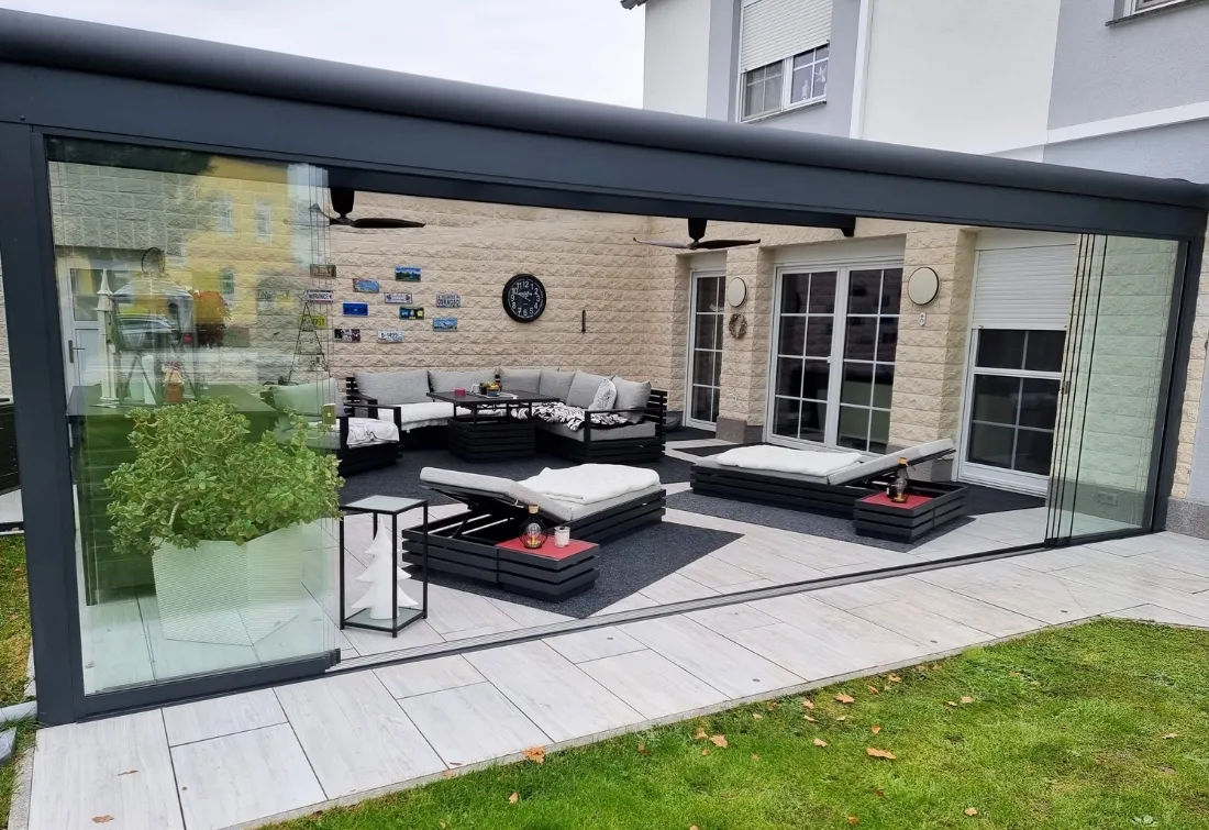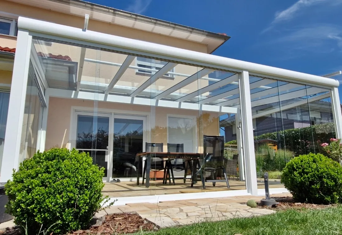 Glasschiebeelemente machen Ihre Terrasse noch flexibler nutzbar. Sie schützen zuverlässig vor Wind und Regen.